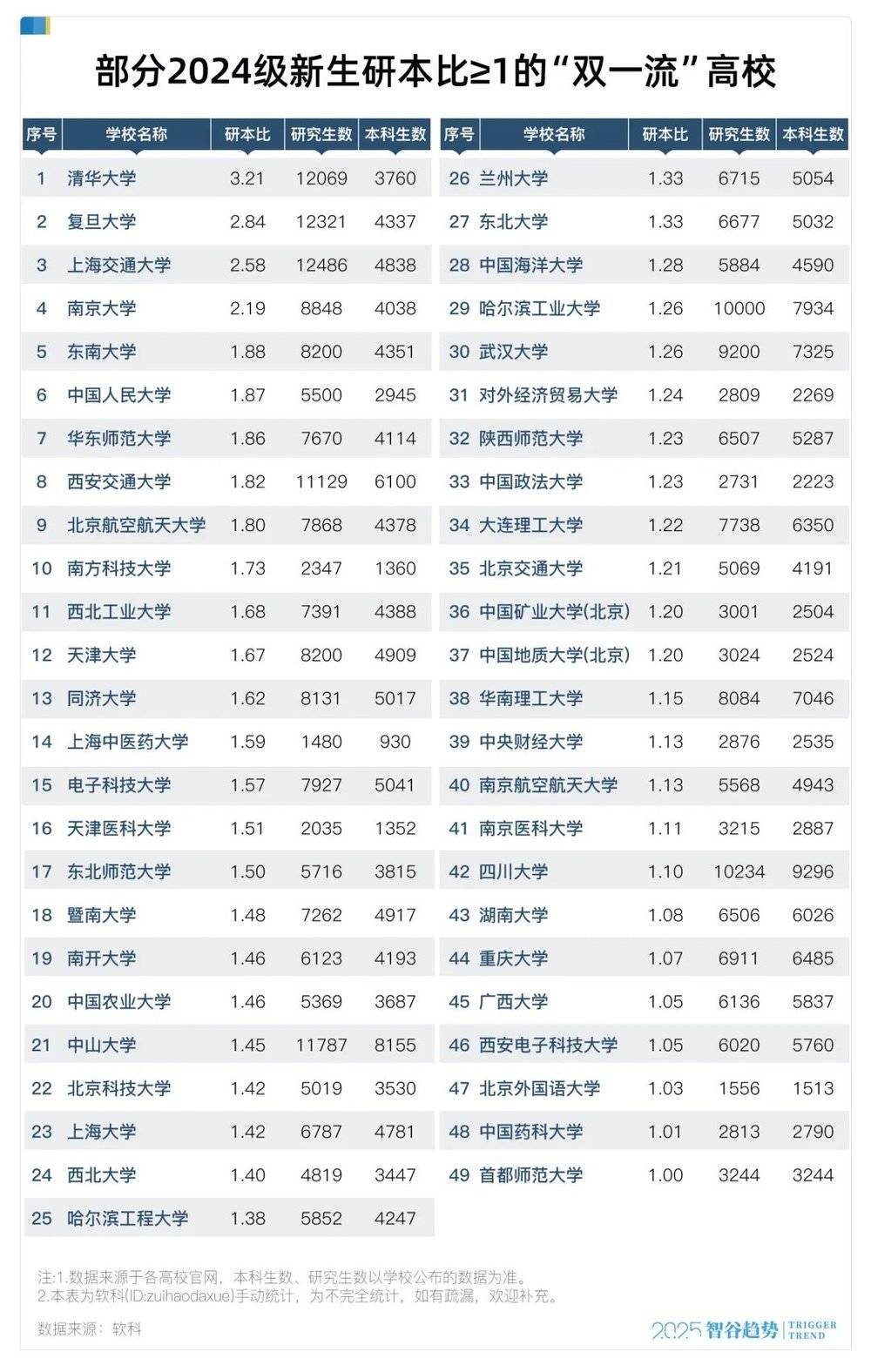 这种现象在2024年新生中,也相当明显。据不完全统计,仅在“双一流”高校中,至少有49所高校,2024级研究生数量超过了本科生。