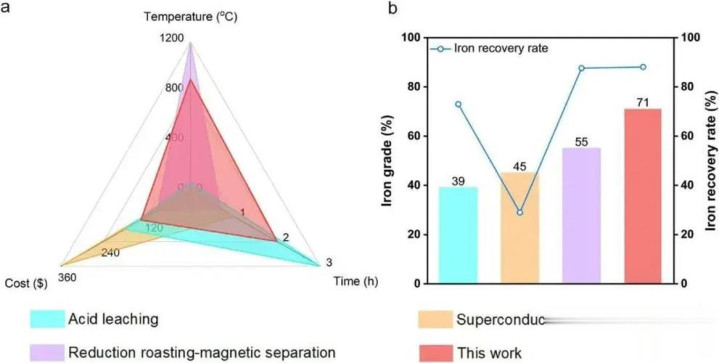 目前国际主流方法包括酸浸法、湿法冶金、还原焙烧-磁选等,但这些技术或成本高昂,或过程复杂,或产生大量废气废液,对环境造成二次污染。